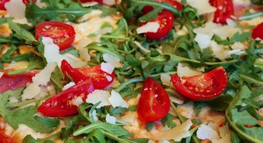 Składa się ona z sosu pomidorowego, mozzarelli, szynki gotowanej, rukoli, sera grana padano i pomidorków kokt…