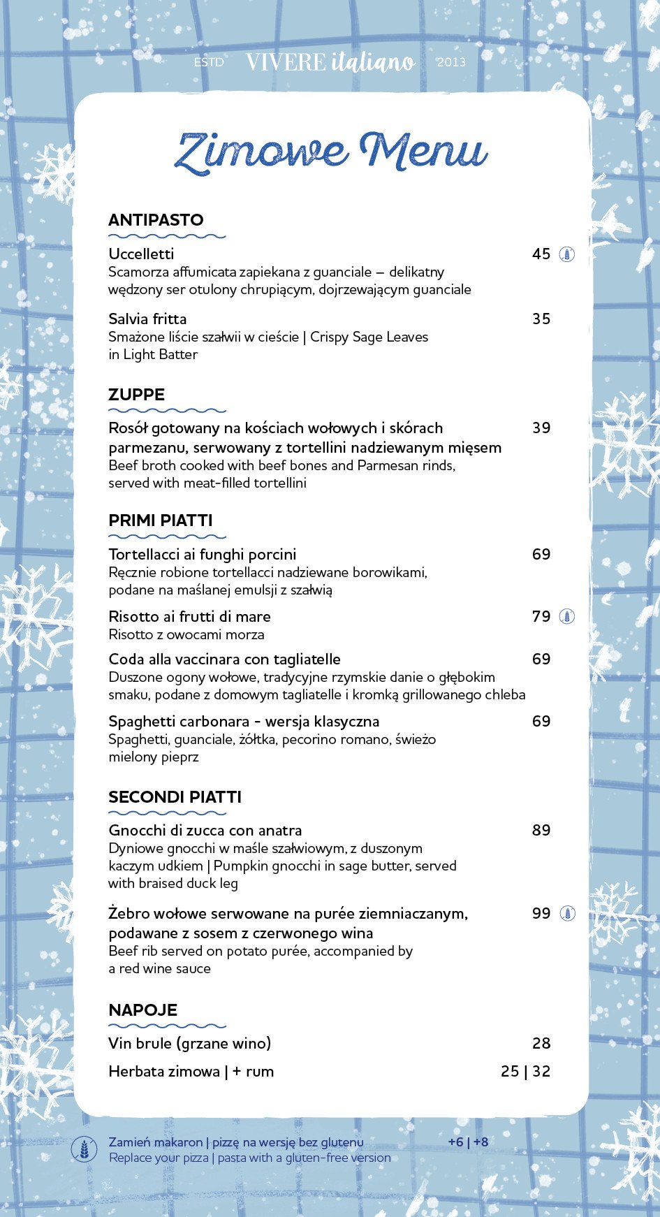Vivere Italiano to restauracja z duszą i ponad 12-letnią tradycją. Kuchnia włoska nie ma przed nami tajemnic! Oferujemy pełne menu bezglutenowe – nasza pizza bezglutenowa to klasyka bez kompromisów. W karcie znajdziesz także świeże owoce morza oraz wyjątkowe wino z różnych regionów Italii. Jeśli szukasz miejsca, gdzie króluje smak i włoska gościnność – restauracja włoska Vivere Italiano zaprasza! Od lat konsekwentnie budujemy naszą jakość – współpracując z małymi, rodzinnymi producentami z Włoch i korzystając z oryginalnych receptur. Każde danie powstaje z pasją i szacunkiem do włoskiej tradycji. Nasza karta win to prawdziwa podróż po Włoszech – znajdziesz w niej zarówno klasyki z Toskanii czy Piemontu, jak z Sycylii oraz Sardynii.